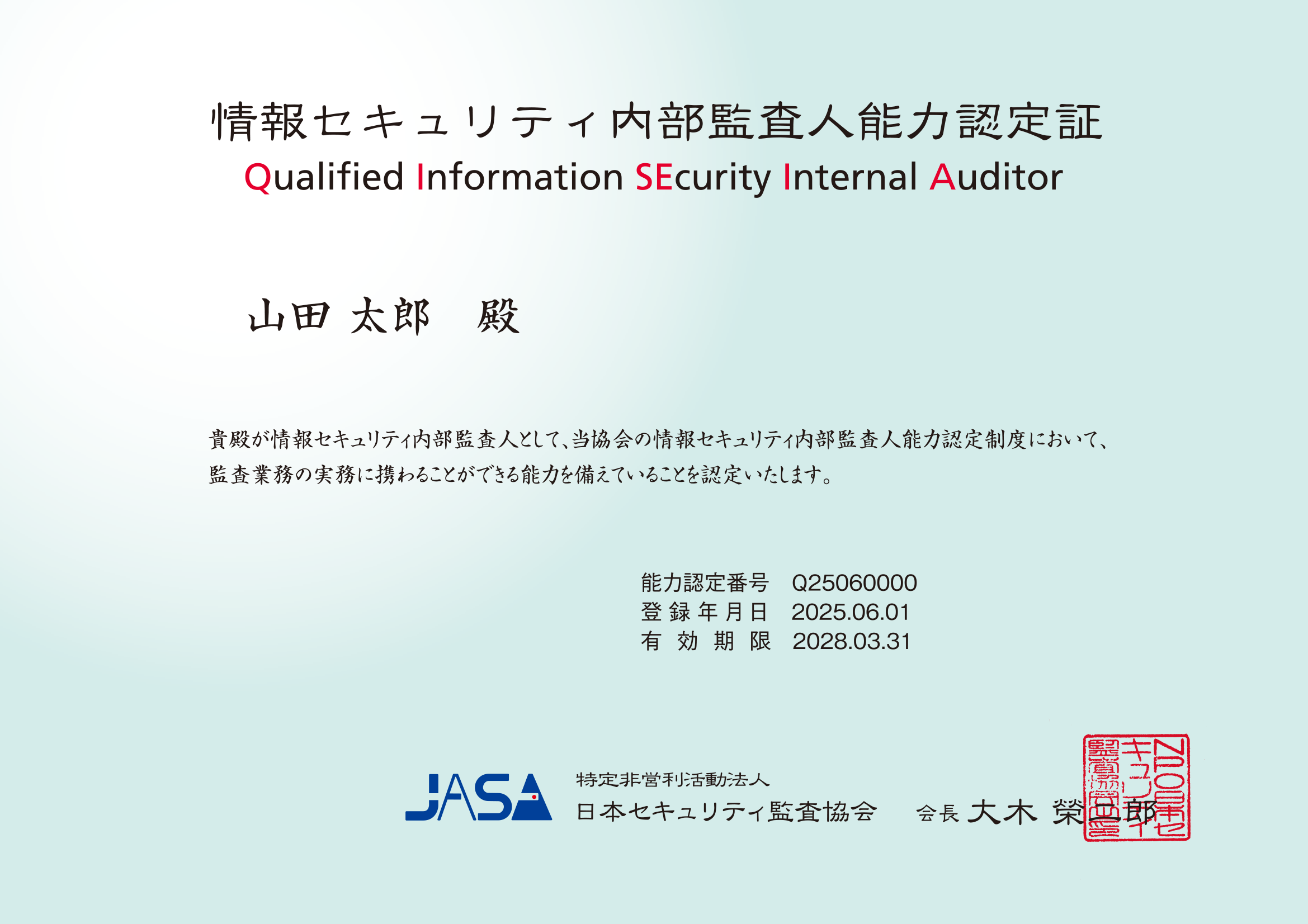 情報セキュリティ内部監査人能力認定証の発行・送付