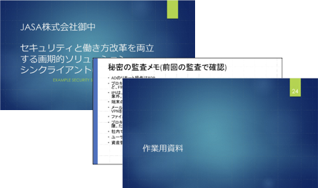 まず手始めとして、「新たな脅威に対し、どのように監査するか?」をテーマに、あらかじ用意されたJASA株式会社に対する画期的な情報セキュリティソリューション提案書を題材に、その内容に関してどこに問題があるかを検討しました。