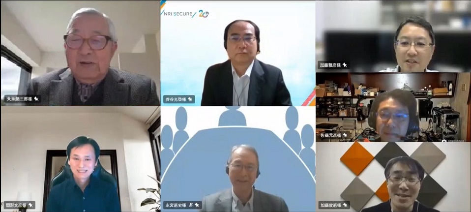 第3回定例研究会は、工学院大学名誉教授 大木氏、長崎県立大学 加藤(雅)氏、日本電信電話株式会社 間形氏、PwCあらた有限責任監査法人 加藤(俊)氏、日本セキュリティ監査協会 永宮氏、NRIセキュアテクノロジーズ株式会社 菅谷氏、伊藤忠商事株式会社/国立大学法人千葉大学 佐藤氏の7名をお招きし、「監査人の警鐘 2021年情報セキュリティ10大トレンド」をテーマに、パネルディスカッション形式でご講演を頂きました。